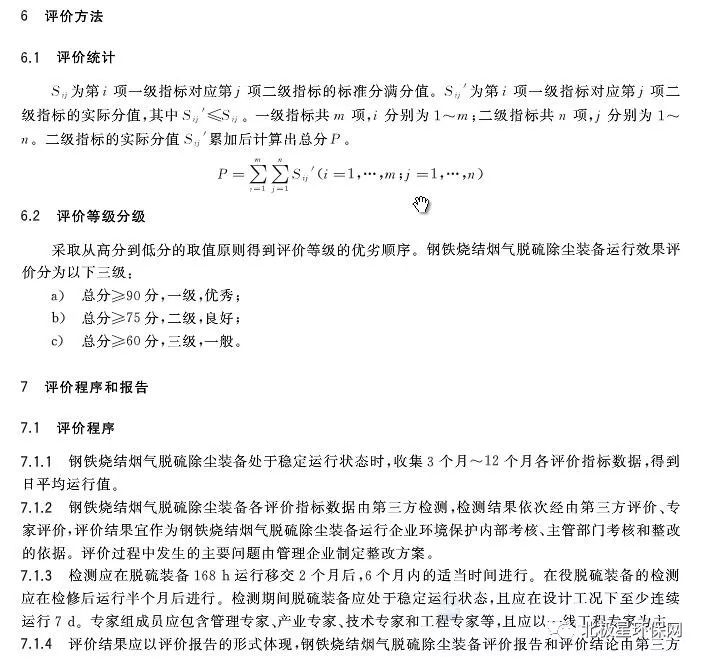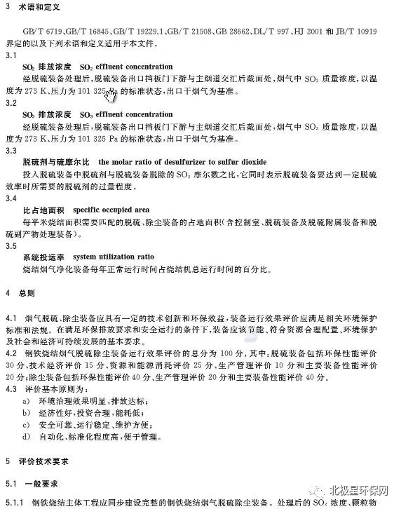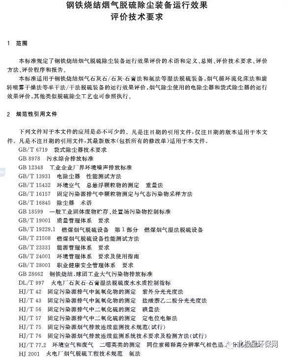 該《標準》適用于鋼鐵燒結煙氣石灰石/石灰-石膏法和氨法等式濕法脫硫裝備,煙氣循環流化床法和旋轉噴霧干燥法等半干法/干法脫硫裝備的運行效果評價,煙氣除塵使用的電除塵和袋式除塵器的運行效果評價,其他類似脫硫除塵工藝也可參照執行。