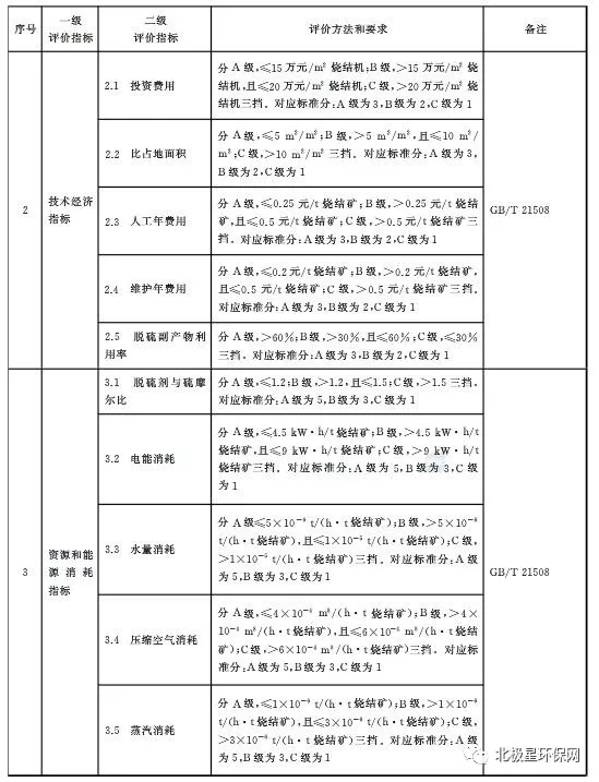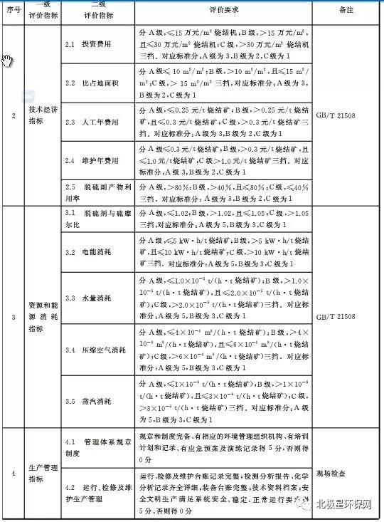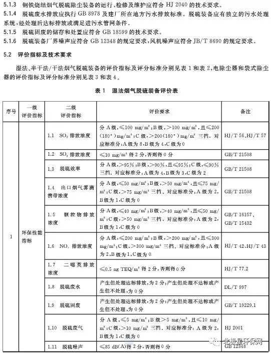 日前,中華人民共和國國家質量監督檢驗檢疫總局、中國國家標準化管理委員會發布《鋼鐵燒結煙氣脫硫除塵裝備運行效果評價技術要求GB/T 34607-2017 》。根據標準要求,鋼鐵燒結煙氣脫硫除塵裝備運行效果評價總分為100分,其中:脫硫裝備包括環保性能評價30分,技術經濟評價15分,資源和能源消耗評價25分、生產管理評價10分和主要裝備性能評價20分;除塵裝備包括環保性能評價40分,生產管理評價20分和主要裝備性能評價40分。濕法脫硫性能指標包括SO2排放濃度、SO3排放濃度、脫硫效率、霧滴濃度、顆粒物排放濃度、NOx濃度、二惡英濃度等,詳見表1。半干法/干法脫硫性能指標包括SO2排放濃度、SO3排放濃度、脫硫效率、顆粒物排放濃度、NOx濃度、二惡英濃度等,詳見表2。電除塵、袋除塵主要性能指標包括顆粒物濃度、去除率、本體漏風率、壓力降等,詳見表3、4。